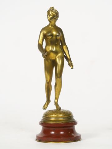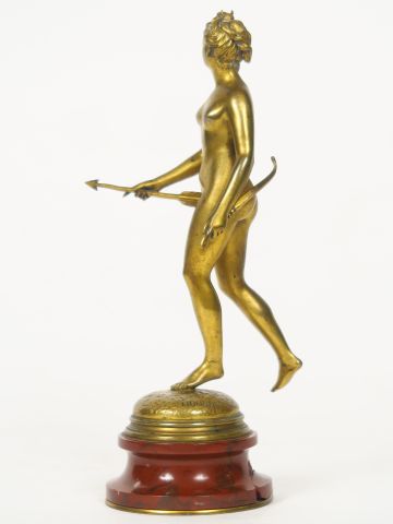 HOUDON (d'après) "Diane chasseresse" Sujet en bronze doré, socle en marbre rouge (accident). H. 21,5 cm