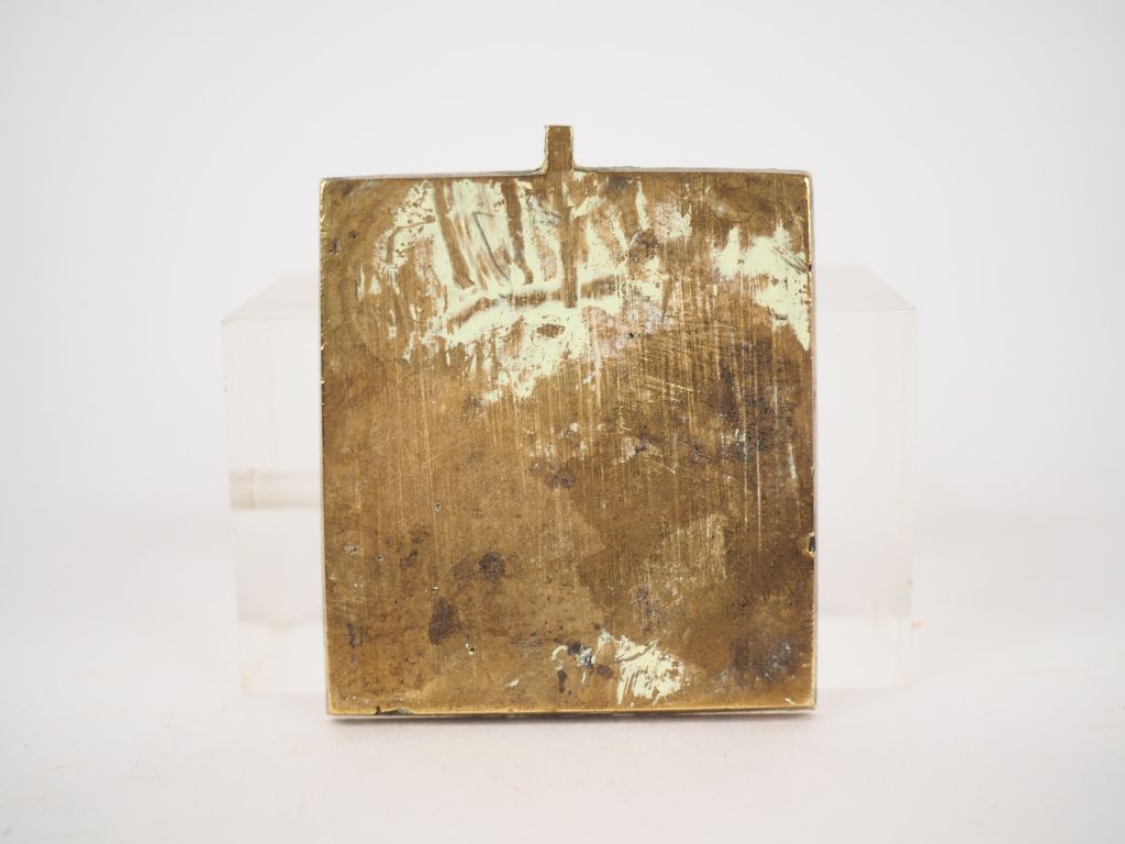 Icône en bronze de saints choisis. Russie, seconde moitié du XIXe siècle. En partie supérieure, les Saintes Parascève Vendredi, Catherine et Barbe toutes trois en buste. En partie inférieure, à gauche Saint Grégoire le Théologien et Saint Jean Chrysostome et à droite Saint Cyr et Sainte Julitte. Bronze fondu, reste d'émail à froid bleu ciel. Dim. 5,5 x 5 cm Expert : Nicolas Filatoff
