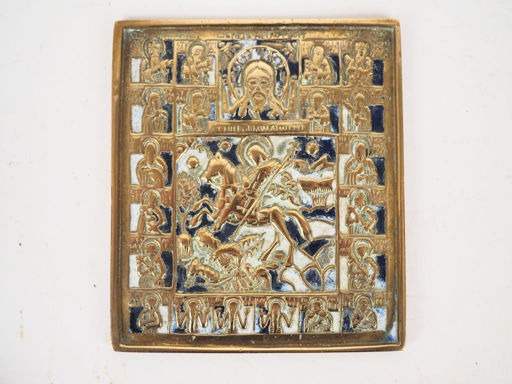 Icône en bronze émaillé du "Miracle de Démétrios de Thessalonique. Moscou, fin du XIXe siècle. Au centre, Saint Démétrios (Dimitri) transperçant de sa lance Lyaeos. Au dessus, la sainte Face, entourée de vignettes avec Saint Vladimir, Saint Jean Chrysostome, Saint Athanase le Grand, Saint Constantin, puis les saints Savva, Paphnuce, Melèce et Lazare. Sur les cotés : les saints Jean Damascène, Ephrèm le Syriaque, Boris et Gleb, Flore et Laure. Sur la rangée du bas : Sainte Marie l'Égyptienne, saints Onuphre, Pierre d'Athènes, Africain de Carthagène, Maron et Alexis de Rome (Homme de Dieu). Bronze fondu, émail à froid blanc et bleu. Dim.11,5 x 10 cm Expert : Nicolas Filatoff