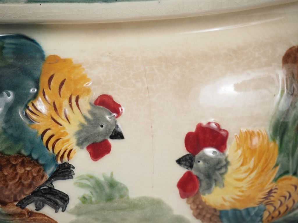 Jardinière 1900 en barbotine à décor de fleurs polychromes sur fond clair, de coqs et de mufles de lion , pieds griffe. Dim. 20 x 44 cm (fel, égrenure)