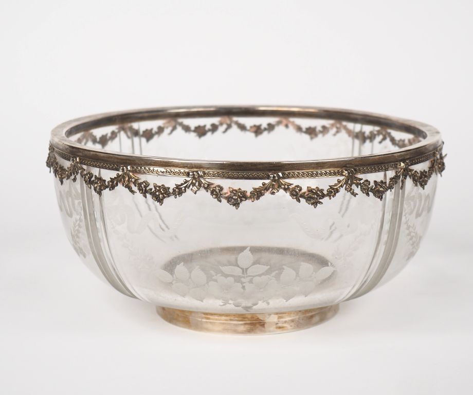 Jatte à crème de style Louis XVI en cristal et argent, poinçon Minerve, à décor de guirlandes de roses. Diam. 23,5 cm H. 11,2 cm