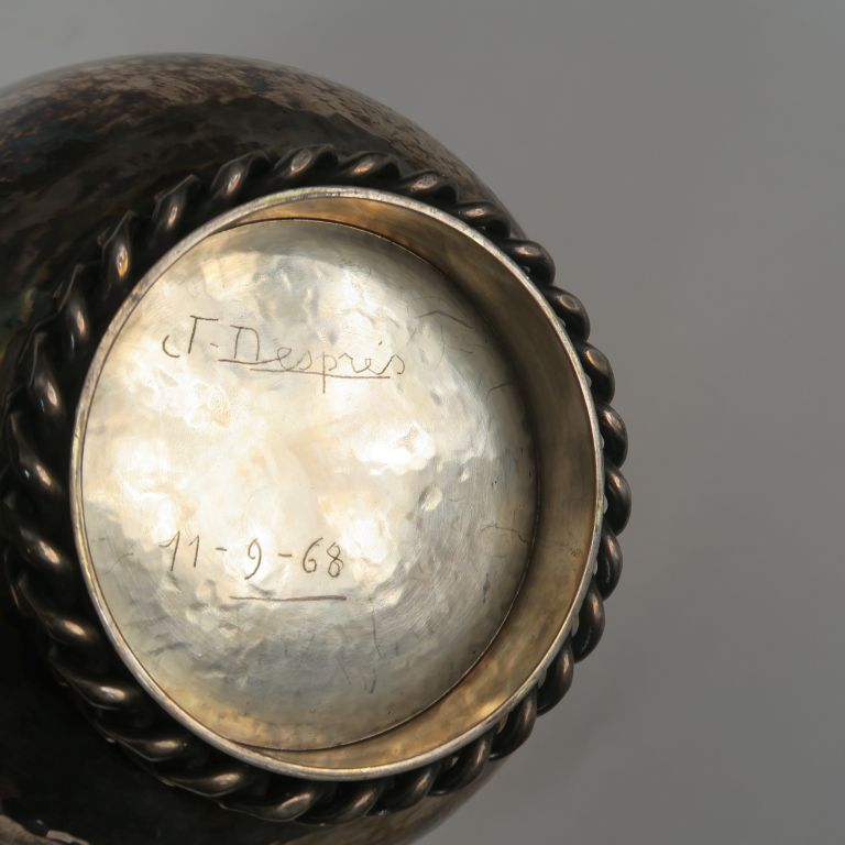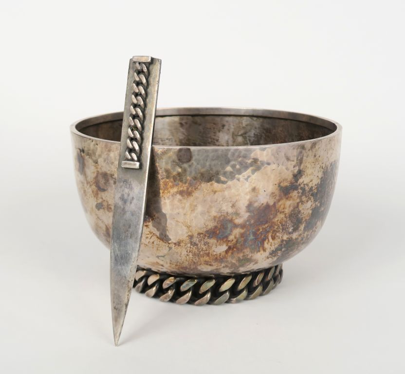 Jean DESPRES. Coupe et un coupe papier en métal. Signée et datée 11 09 68 H. 11,5 cm Diam. 18,5 cm. Longueur coupe papier : 16,5 cm