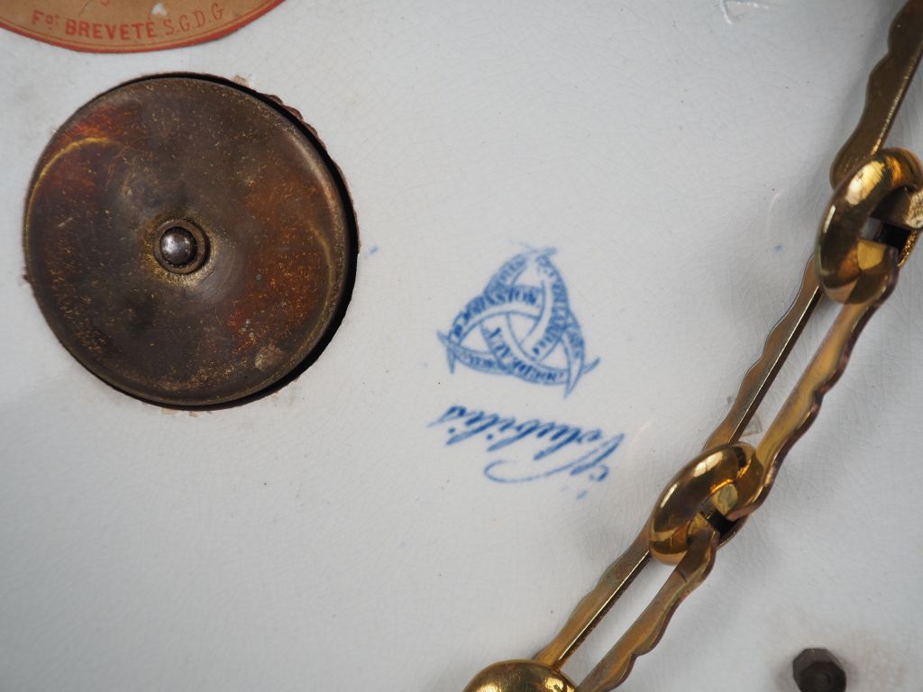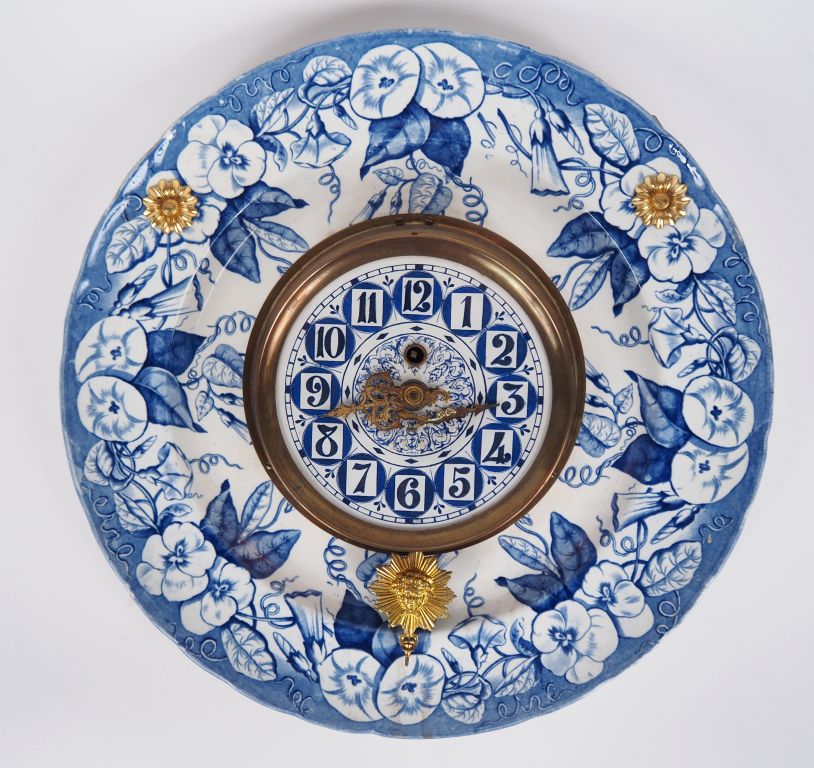 Jean VIEILLARD à Bordeaux. Pendule murale en faïence fine laiton et papier peint à décor en camaïeu bleu de volubilis. Signée. Diam. 40 cm. (une aiguille accidentée.)