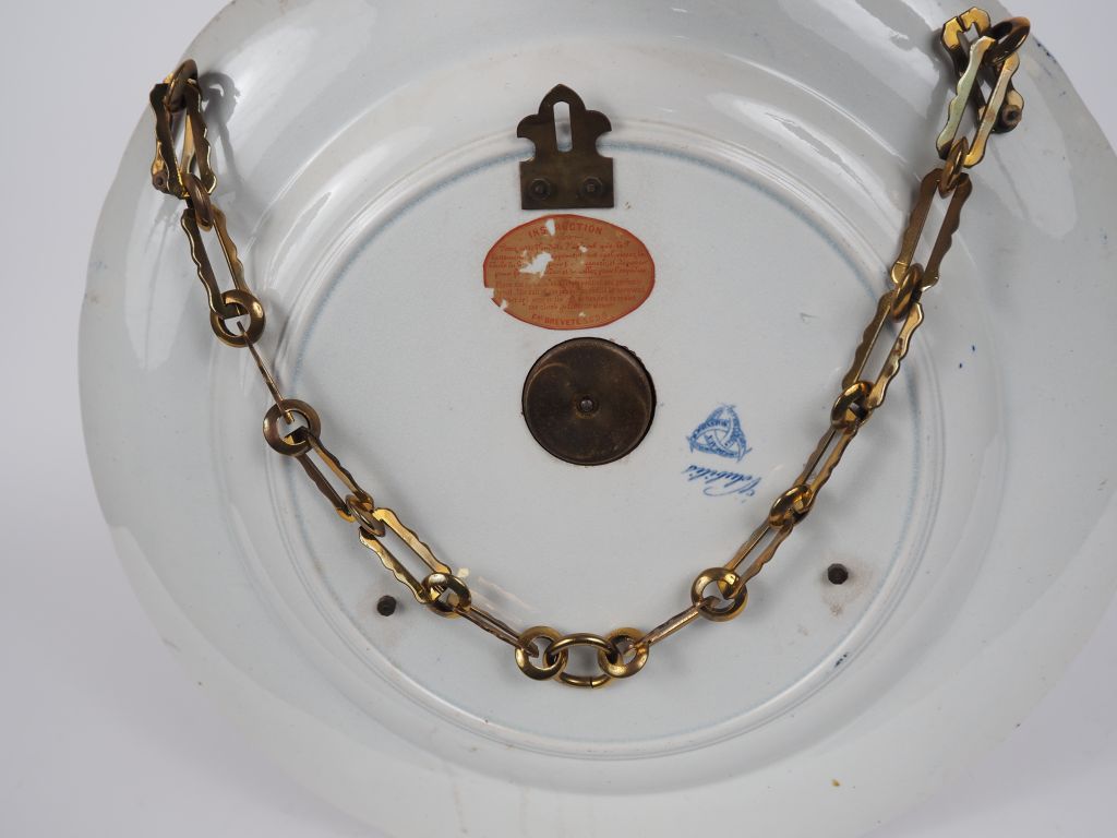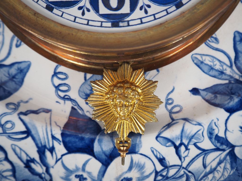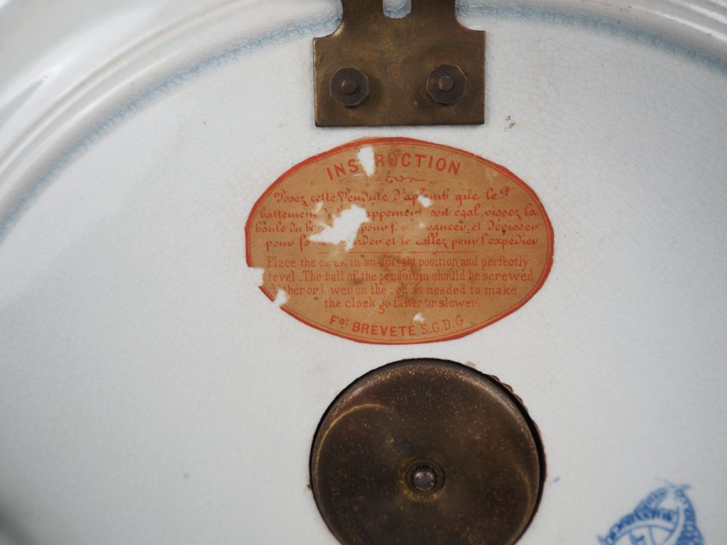 Jean VIEILLARD à Bordeaux. Pendule murale en faïence fine laiton et papier peint à décor en camaïeu bleu de volubilis. Signée. Diam. 40 cm. (une aiguille accidentée.)