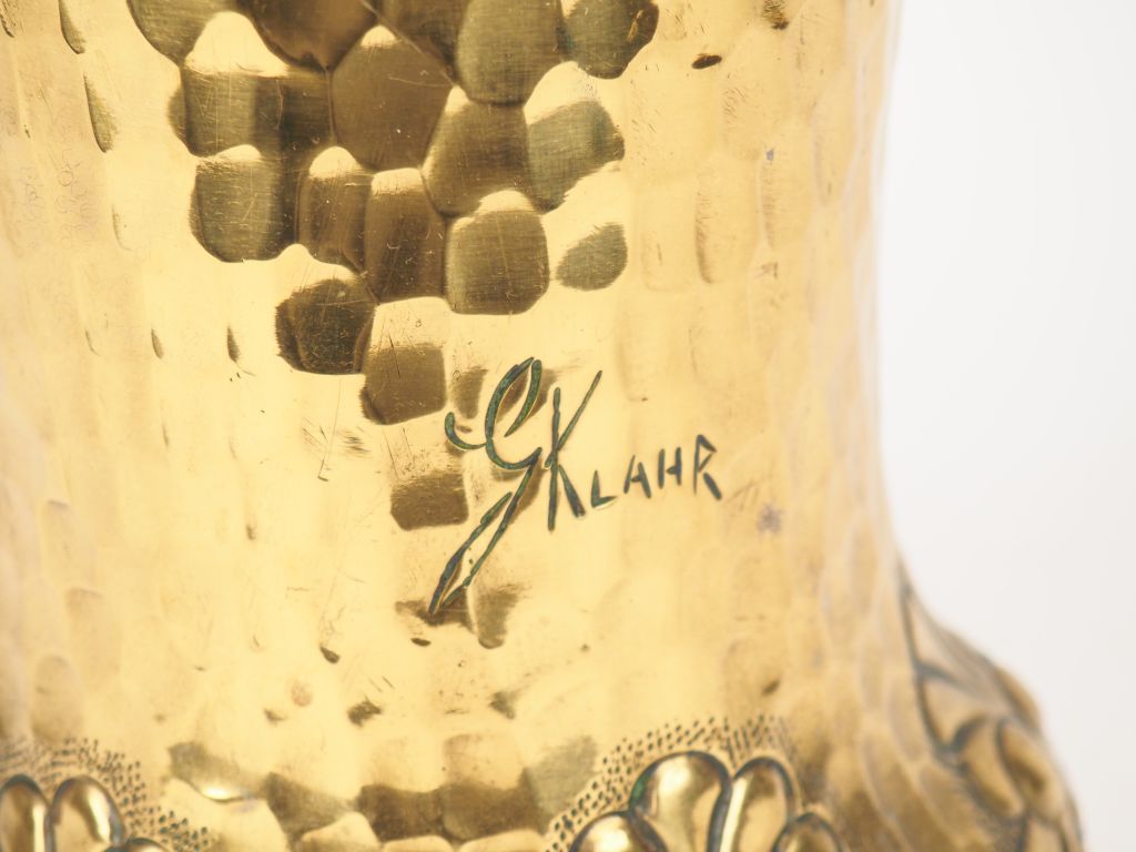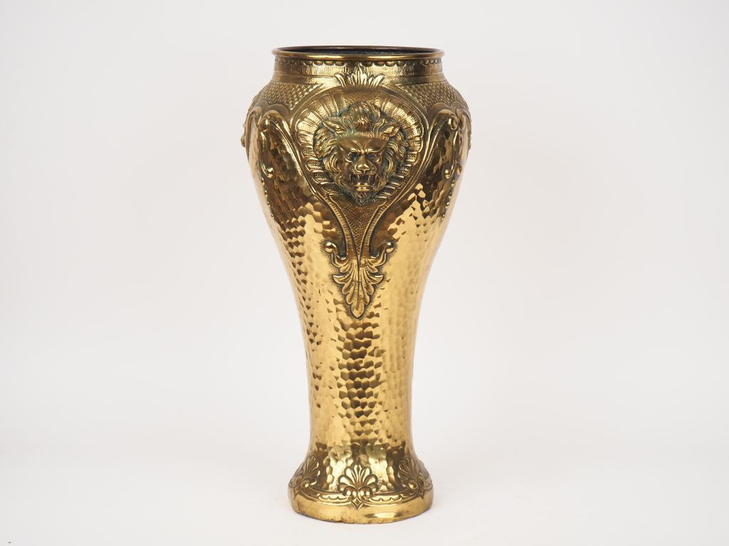 KLAHR. Porte parapluie en laiton repoussé à décor de mufles de lion. Signé H. 60 cm