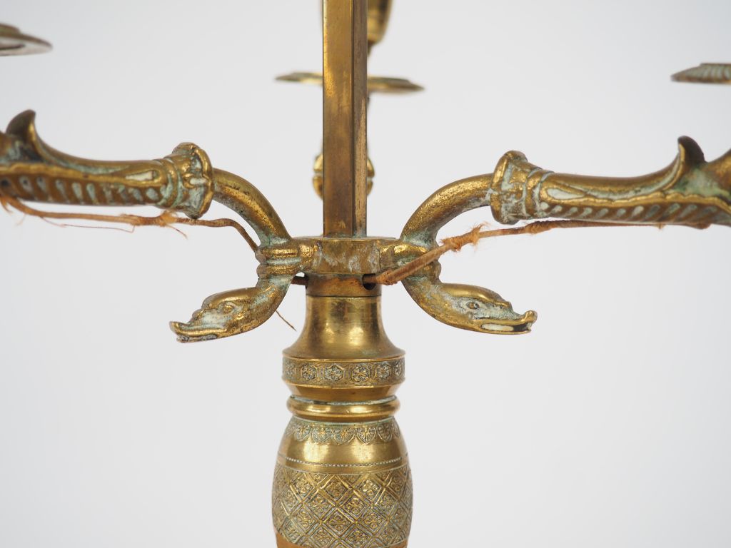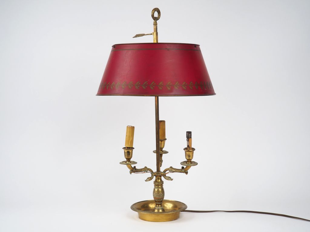 Lampe bouillotte de style Empire en bronze, éclairant à trois lumières, abat-jour en tôle rouge.