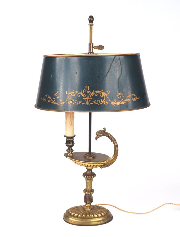 Lampe bouillotte de style Empire en tôle, bronze et laiton en forme de lampe à huile antique, à décor d'aigle. H. 52 cm.