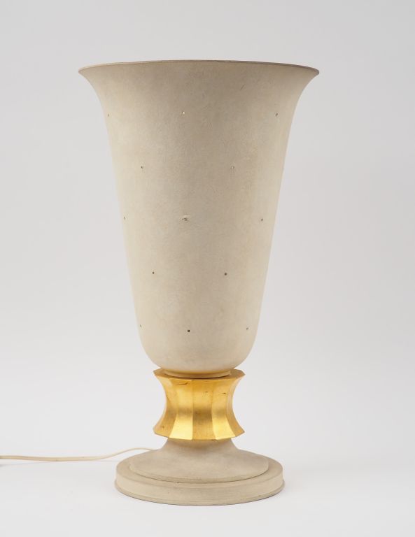 Lampe cornet 1940 en tôle laquée blanc et doré.. H. 51 cm.