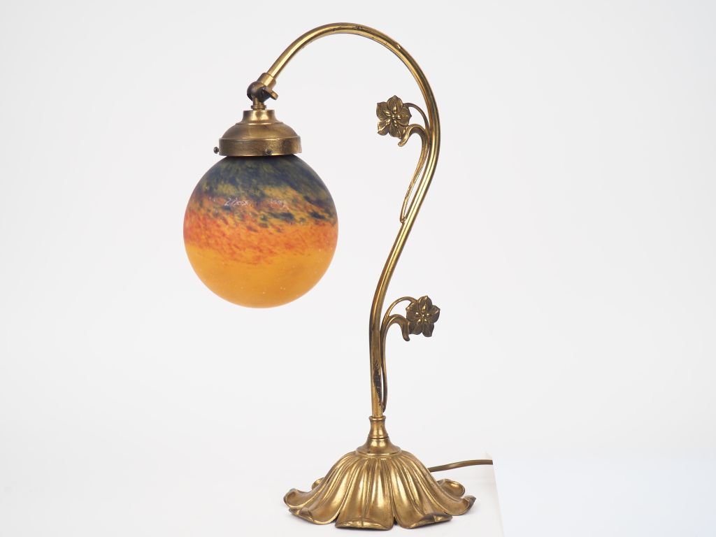 Lot de Lampe de style Art Nouveau en métal et verre marbré polychrome. H. 42 au prix de 100 à 150 € en vente aux enchères par l'hôtel des ventes Primardeco