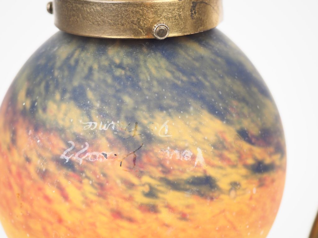 Lampe de style Art Nouveau en métal et verre marbré polychrome. H. 42...
