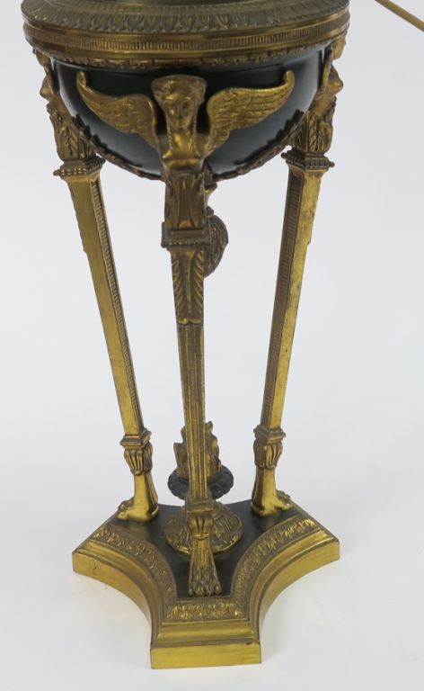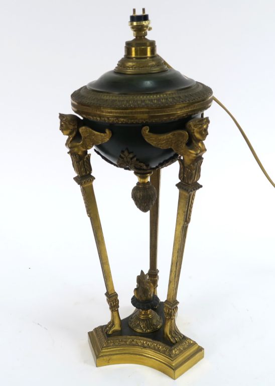 Lampe en forme d'athénienne de style Empire en bronze patiné et doré, à décor de buste de femmes ailées, de pot à feu et de pigne de pin. H. 47,5 cm