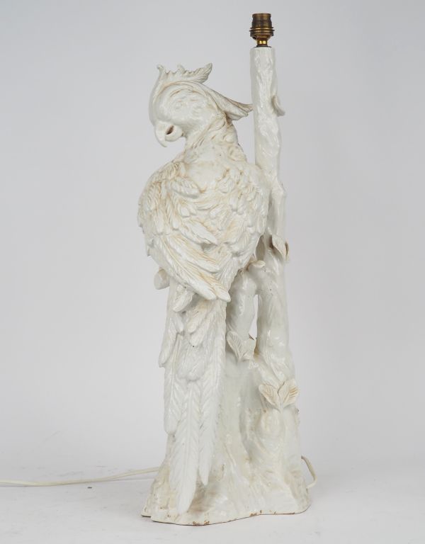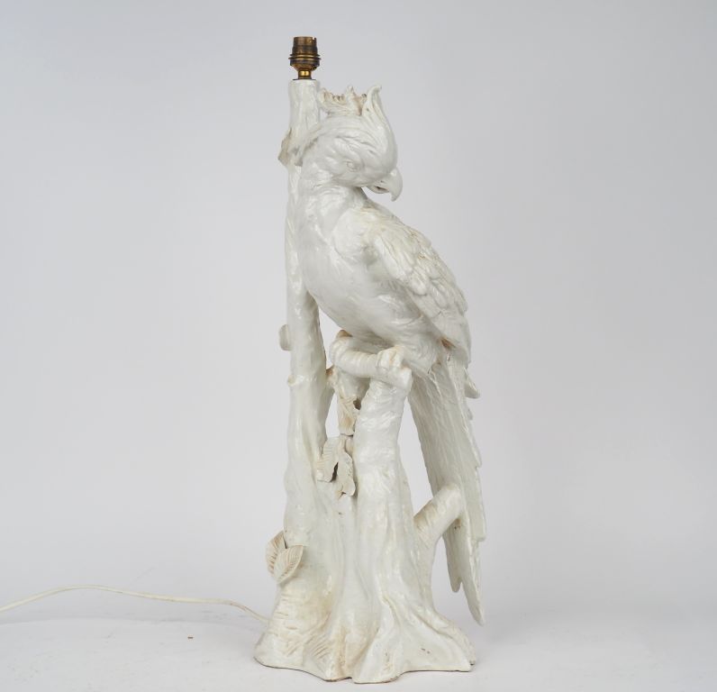 Lampe en porcelaine blanche figurant un perroquet branché. H. 58,8 cm. (Légères égrenures).