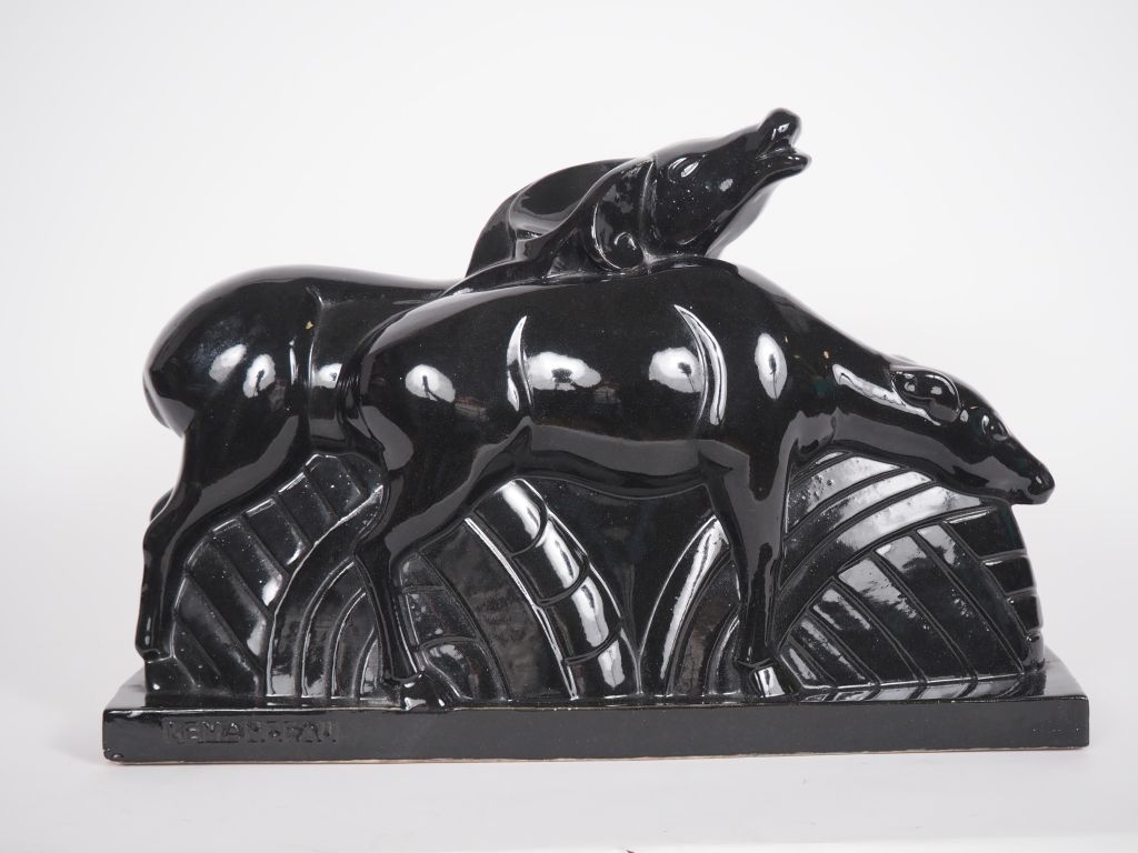 LEMANCEAU. Groupe Art Déco en céramique noire "les biches" Signé Dim. 29 x 45 cm (petite égrenure à un angle)
