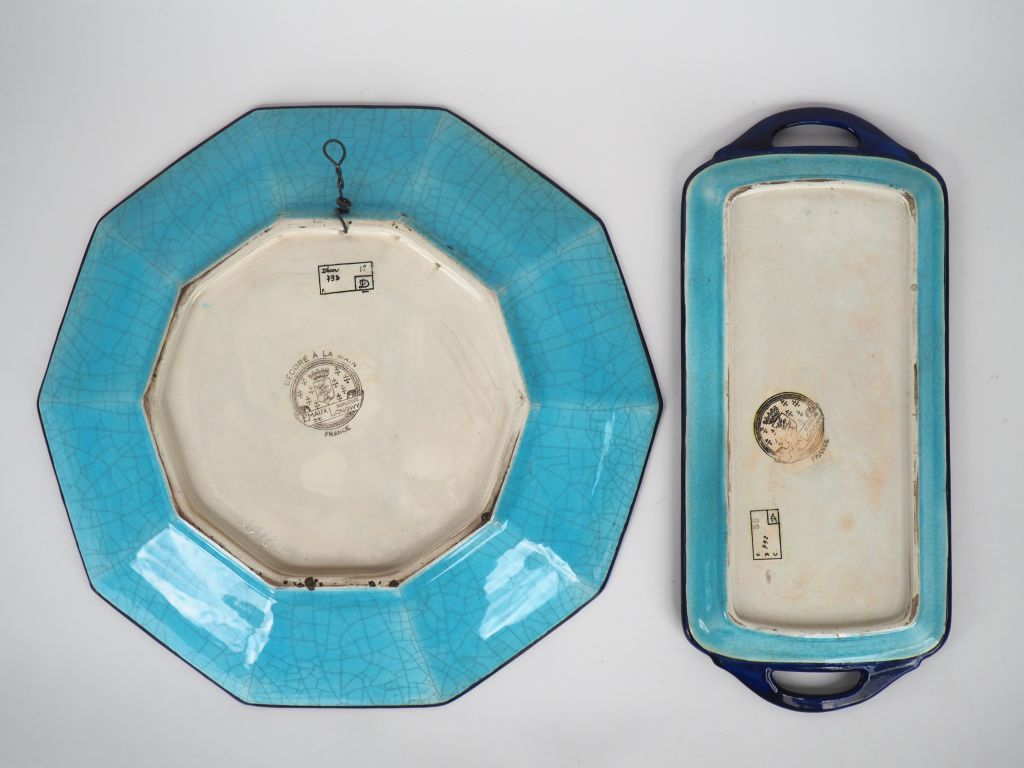 LONGWY. Plat à cake en émaux polychromes à décor de fleurs et un grand plat hexagonal en émaux polychromes à décor de fleurs et de cigognes dans une réserve. Dim. plat : 17 x 39 cm Dim plat hexagonal : 40 x 39 cm
