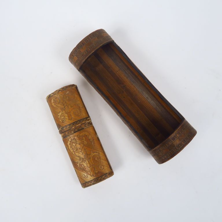 Lot comprenant : - quatre différents étuis XIXème en marqueterie de paille, à décor de motifs géométriques. H. 12,5 - 13,5 et 17 cm (très légers manques) - un étui et un vide-poche XIXème en marqueterie de paille. H. 14 cm et 19 cm (petits manques)