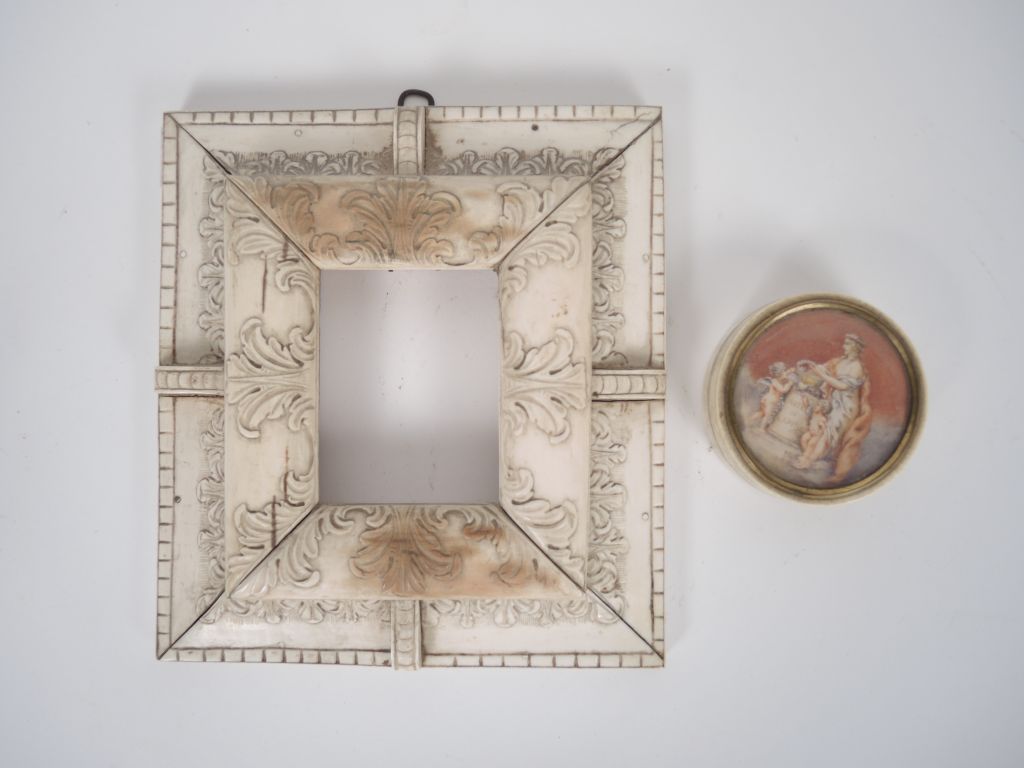 Lot comprenant : - une boite en ivoire, à décor d’une miniature. Diam. 7,5 cm - un cadre en ivoire de style Louis XIII. 20 x 18 cm