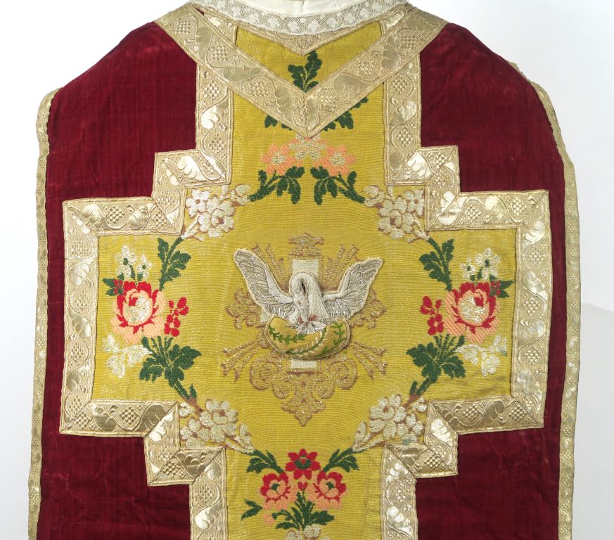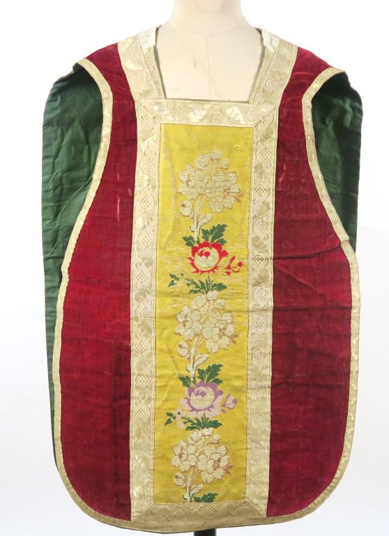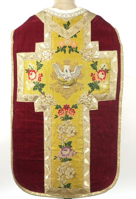 Lot comprenant une chasuble et son manipule XIXème. Fond velours de soie grenat. Orfroi avant formé d’un drap d’or fleuri, décor arrière à la croix rudentée au fond d’or délimitant un décor floral avec pélican symbole du Christ Sauveur, brodé en guipure au filé or, et filé et frison argent. Etat d’usage. (petites traces d’usure) Expert : Véronique Dumont Castagné