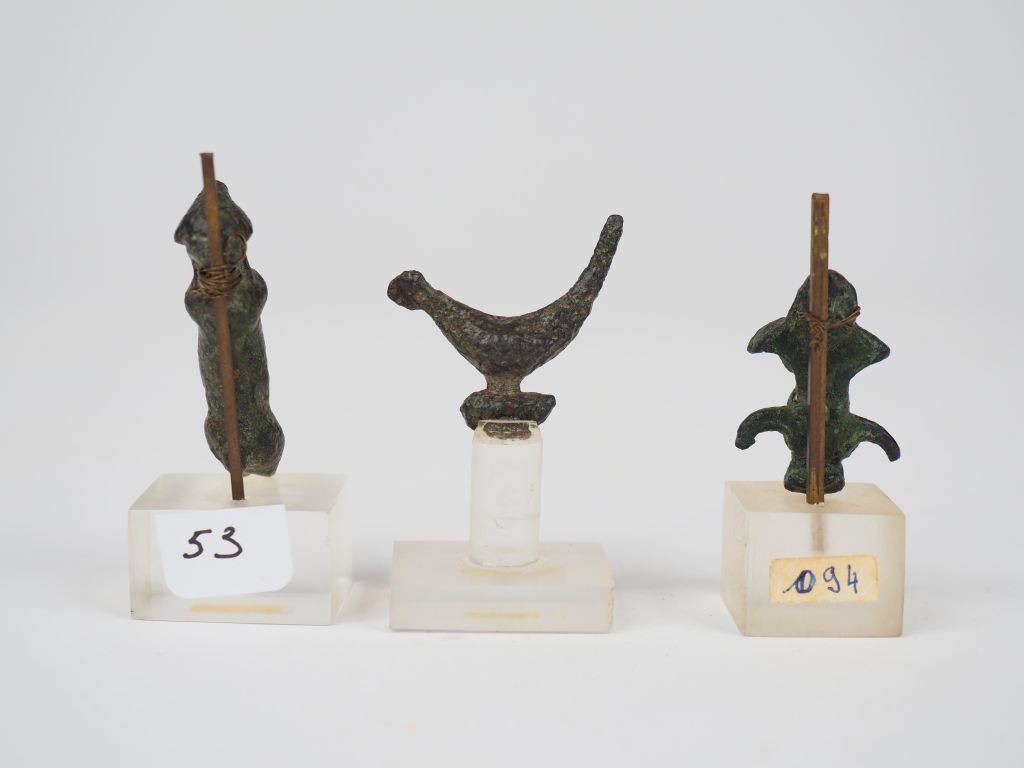Lot d’animaux et décor végétal en bronze. Période romaine ou antérieure. H. : 4 cm, 3 cm, 2,5 x 3 cm.