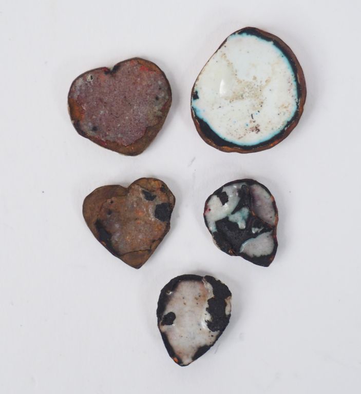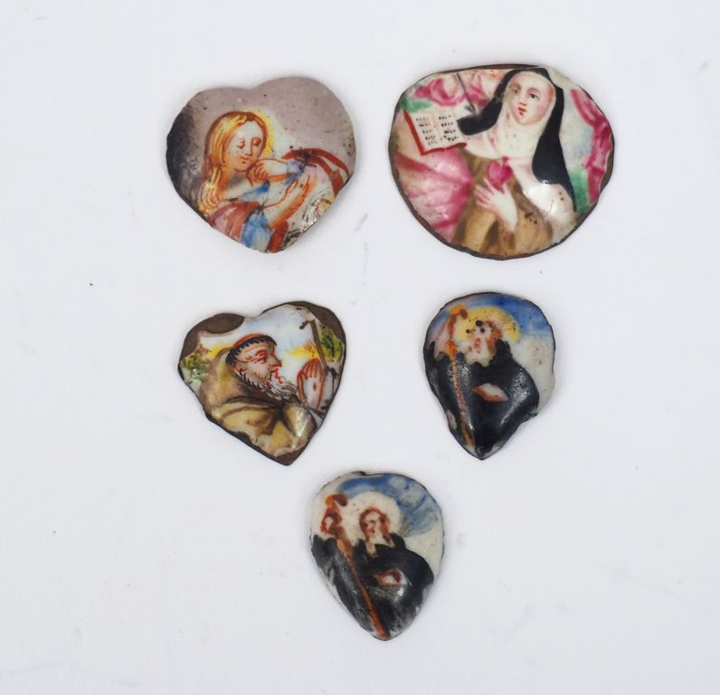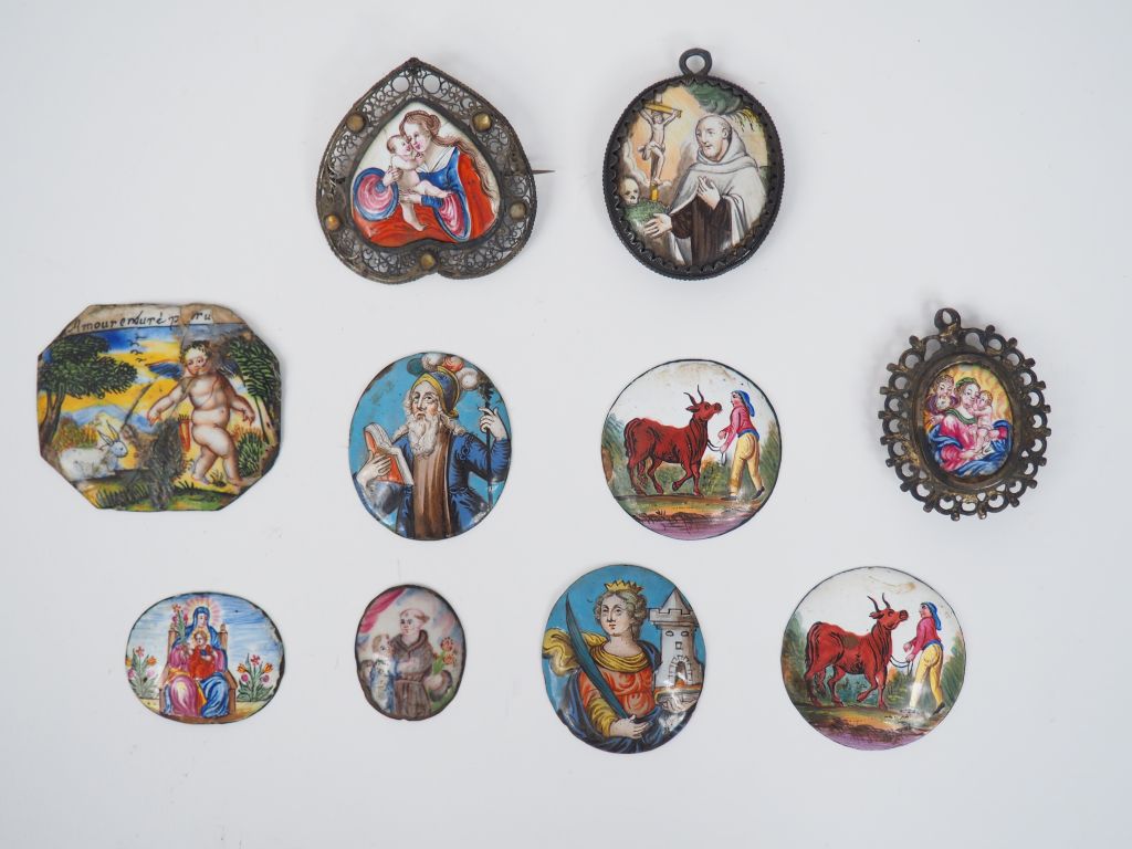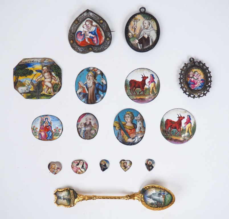 Lot de 15 petites plaques en émail peint polychrome. XVIIème - XVIIIème ou XIXème siècles. On joint une cuillère émaillée (quelques accidents) Expert : Laurence Fligny