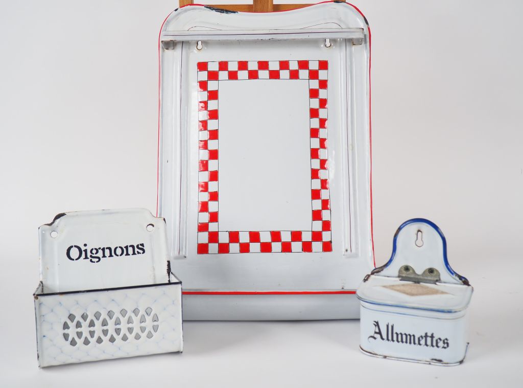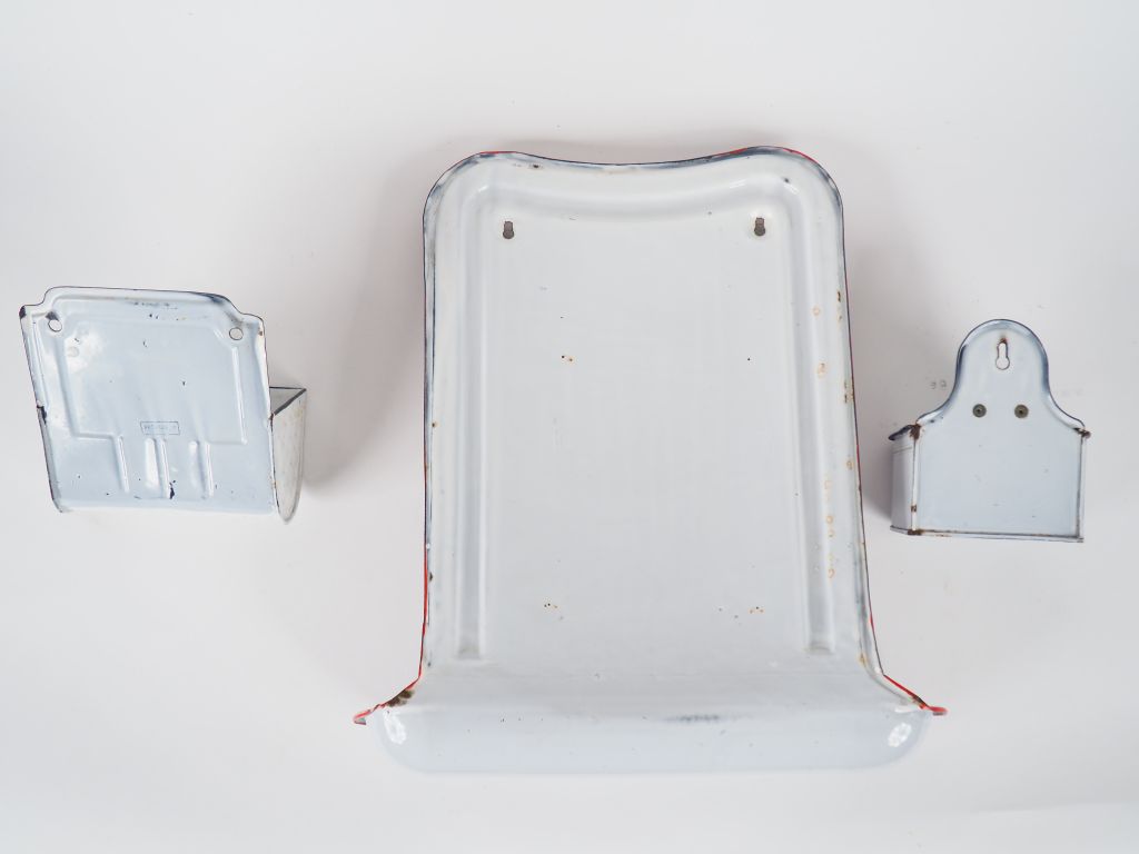 Lot de trois présentoirs en tôle émaillée. Dim. : 50 x 45 cm/20 x 17 cm/16.5 x 13 cm