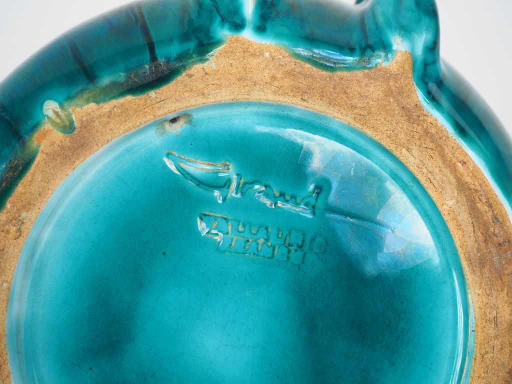Louis GIRAUD à Vallauris. Cendrier en céramique verte à décor de cordages. Signé. Dim. 7,5 x 19 cm. (petits sauts d'émail).