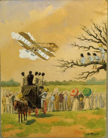Lucien ROUSSELOT. Aquarelle, signée en bas à droite. '10 décembre, Saigon pour la première fois un avion pilote 'Van Den Born' sillonne le ciel de l'Indochine. 26,5 x 20,5 cm vente avec faculté de réunion