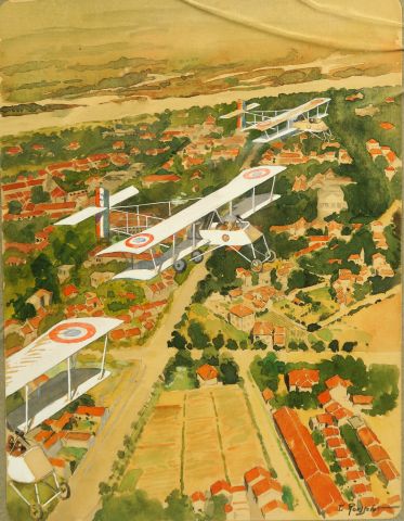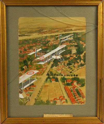 Lucien ROUSSELOT. Aquarelle, signée en bas à droite. '1917, l'Escadrille n° (appareils Voisin) créée au Tonkin sur le vol Hanoï'. 26,5 x 20,5 cm vente avec faculté de réunion