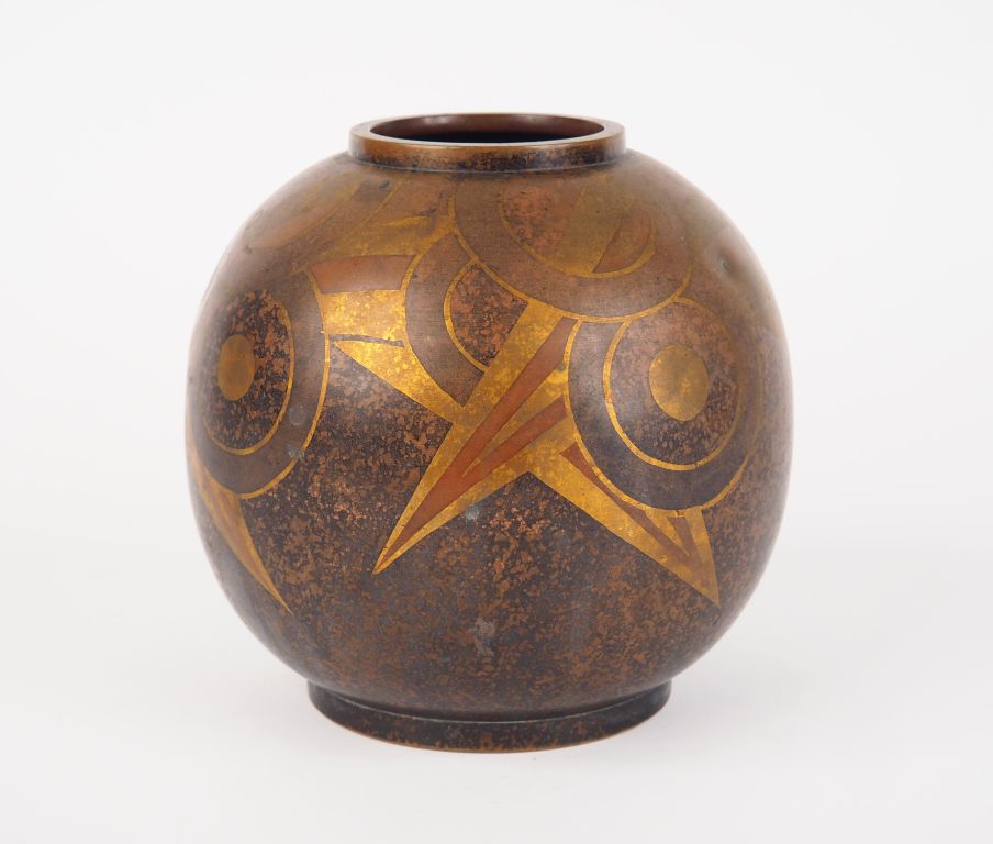 M. CHARLES. Vase boule Art déco en dinanderie, à décor de motif géométrique. Signé. H. 15,5 cm (petit choc sur le côté)