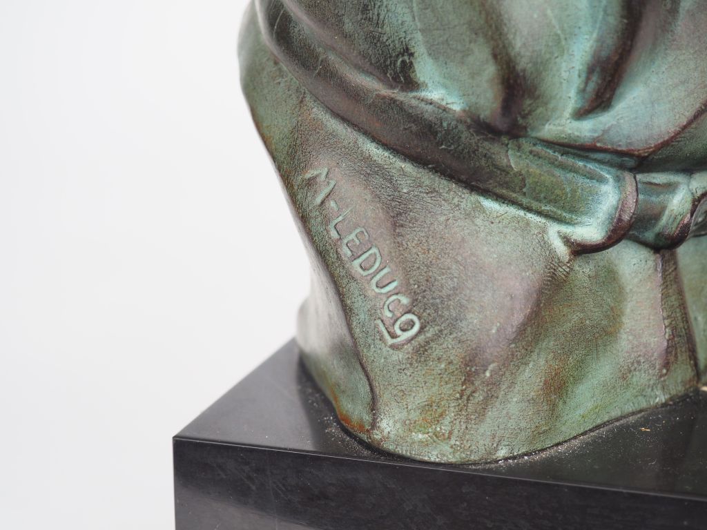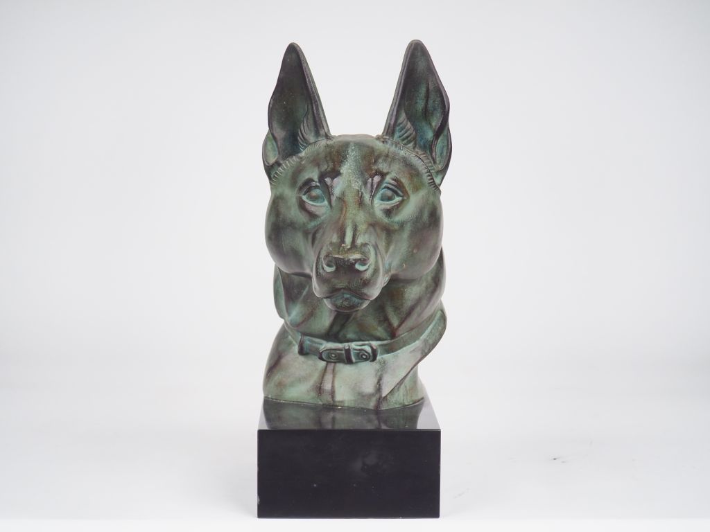 M. LEDUCQ. "Malinois". Sculpture en régule à patine verte, socle en marbre noir. Signée. Dim. (sans le socle). 25,5 x 24,5 x 13,5 cm.
