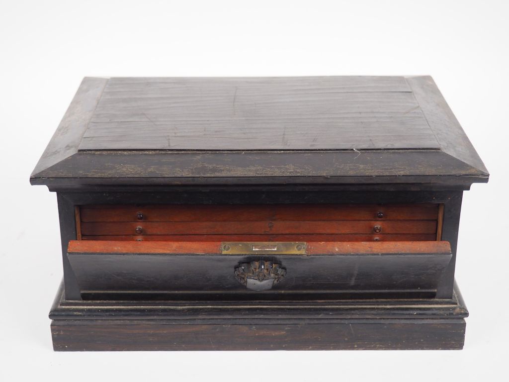 Médaillier Napoléon III en placage d'ébène, intérieur en acajou. Ouvrant à un abattant dégageant 6 compartiments. Dim : 17 x 35,5 x 26,4 cm. (Petits sauts de placage).