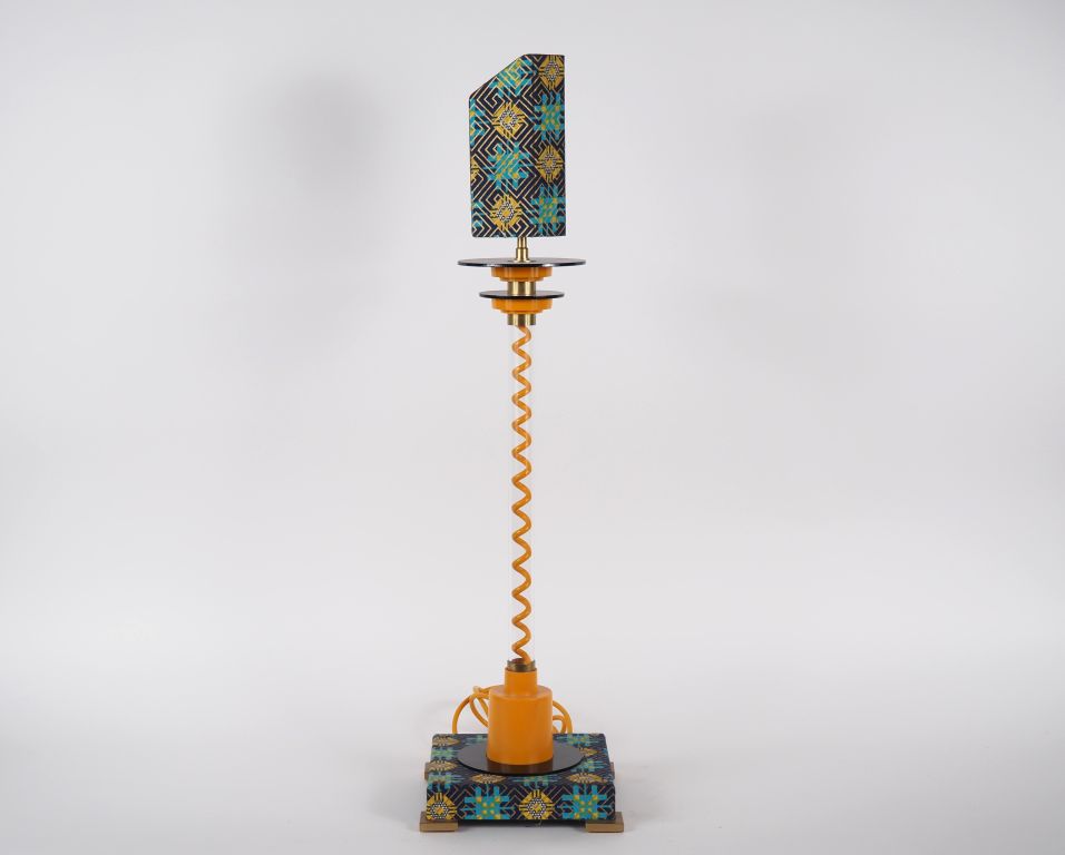 MEMPHIS (dans le goût de). Lampe en métal laqué, plastique et textile. H. 71 cm.