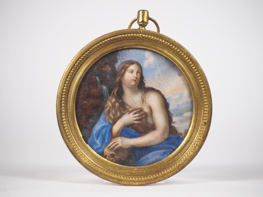 Miniature XVIIIème dans un cadre en bronze doré, "Sainte Madeleine". Diam. (à vue) : 9 cm.