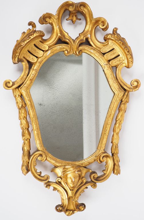 Miroir XIXème de style italien en bois et stuc doré sculpté à décor de masque, de guirlandes et de rinceaux. Dim. : 81,5 x 53 cm. (accidents).