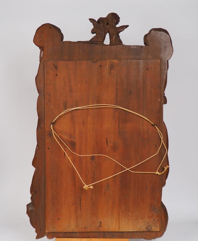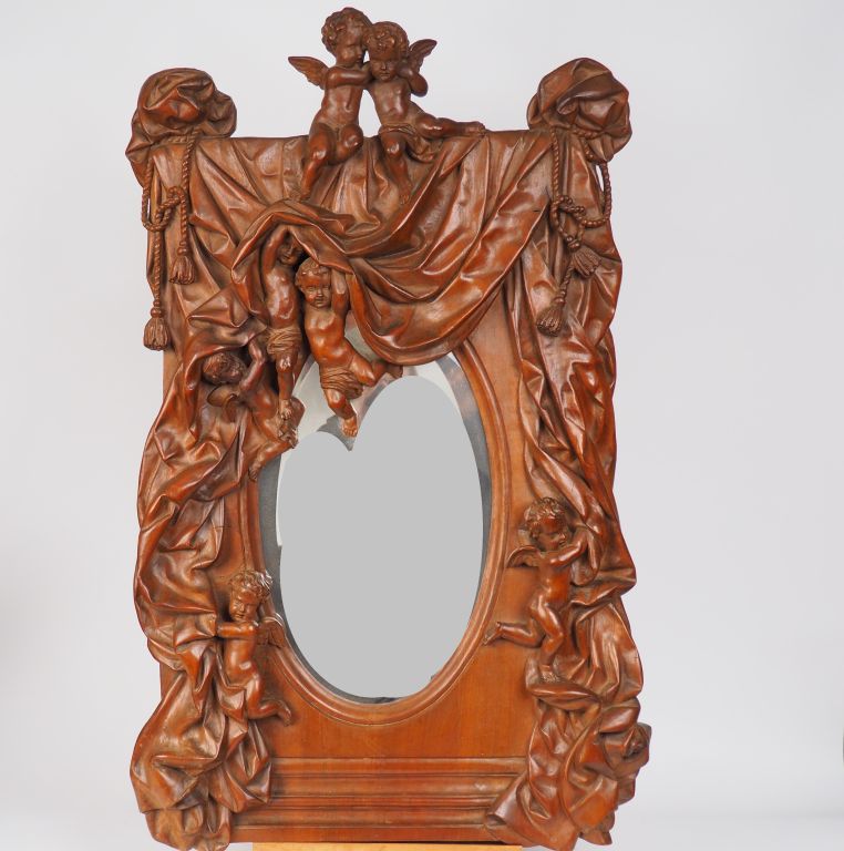 Miroir XIXème en bois sculpté à décor d'amours dans une draperie. Dim. : 99 x 62 cm.