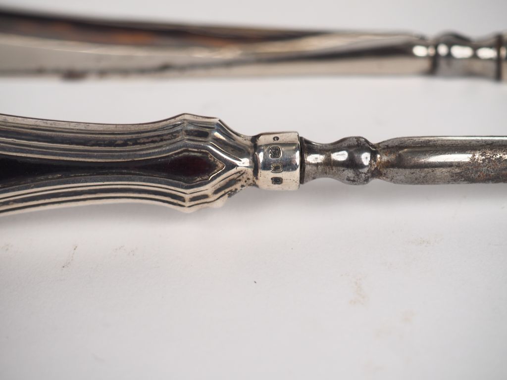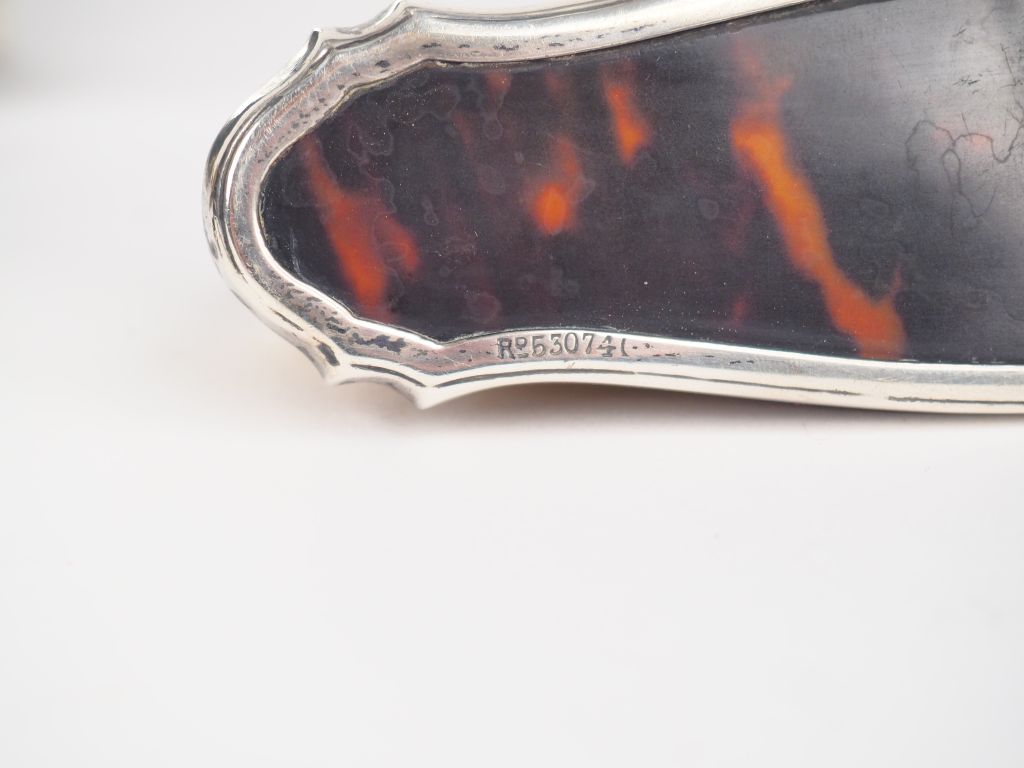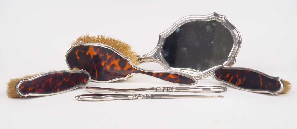 Nécessaire de toilette en argent anglais et écaillle brune Comprenant: - 3 brosses - un face à main - un crochet - un chausse-pieds