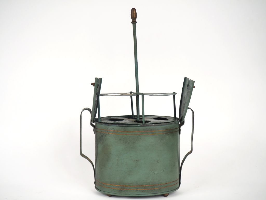 Oeufrier de style Empire en tole verte et dorée. Dim . 28 x 25 x 12 cm.