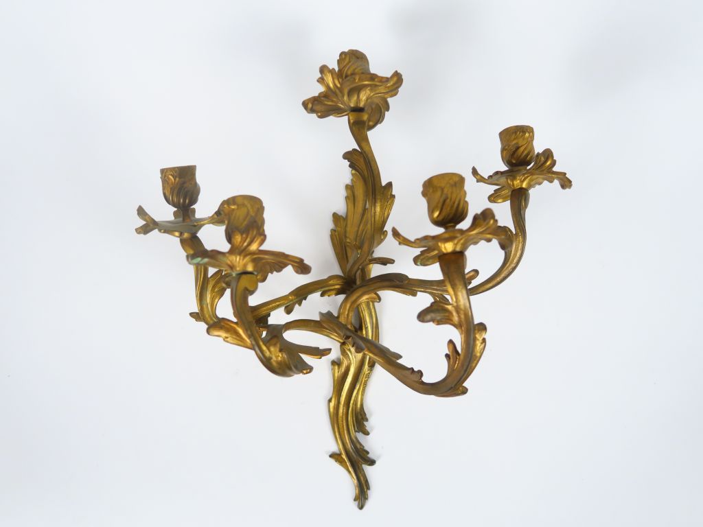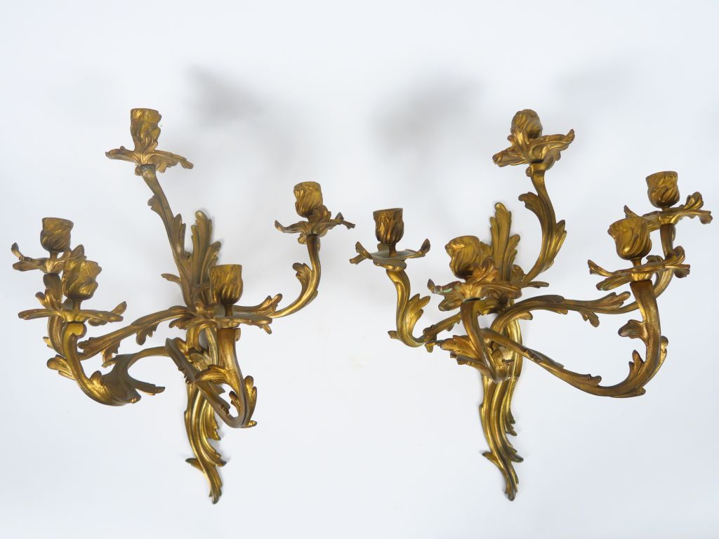 Paire d'appliques de style Rocaille en bronze doré, éclairant à cinq lumières. H. : 45 cm.