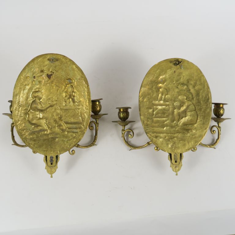 Paire d'appliques doubles à réflecteur de style Louis XVI en bronze à décor de marchande d'amours et de mascarons. Dim. 31 x 32 cm