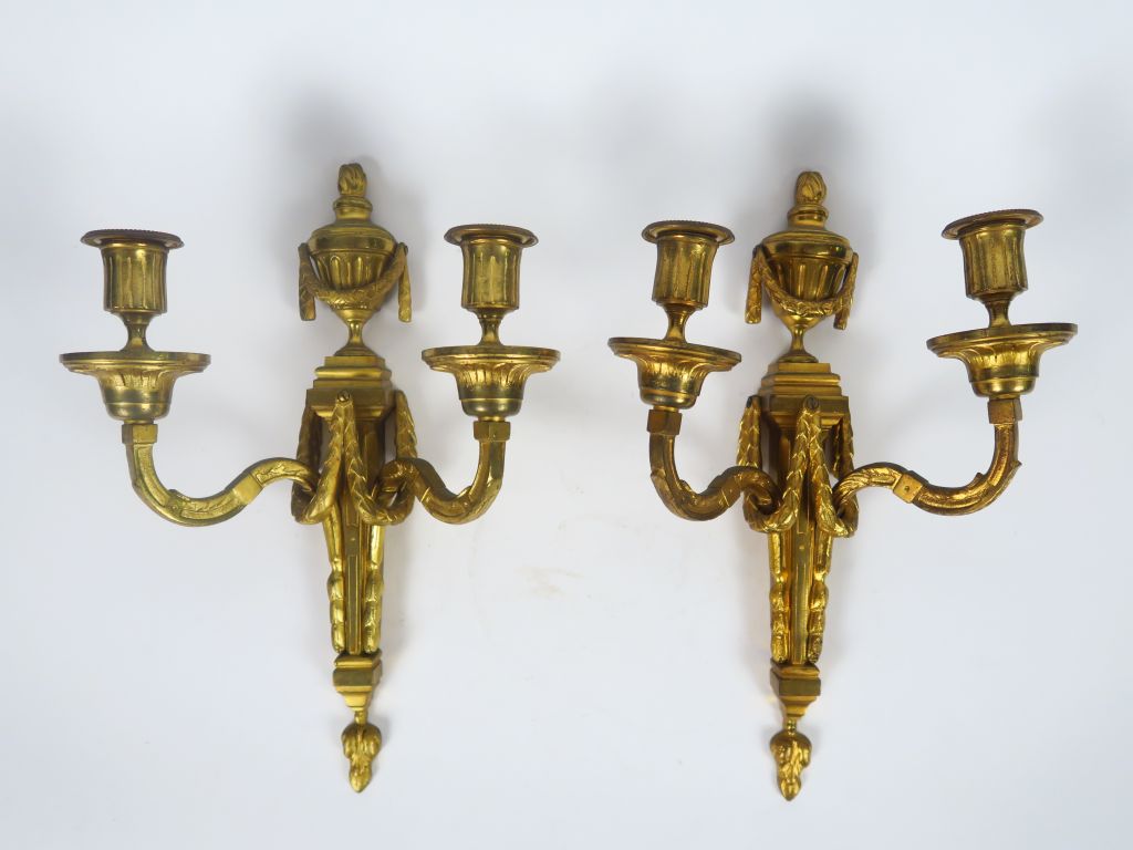 Paire d’appliques doubles début XIXème en bronze doré, à décor de guirlande de fleurs, de laurier et de pots à feu. Signées DIDIER. H. 38 cm