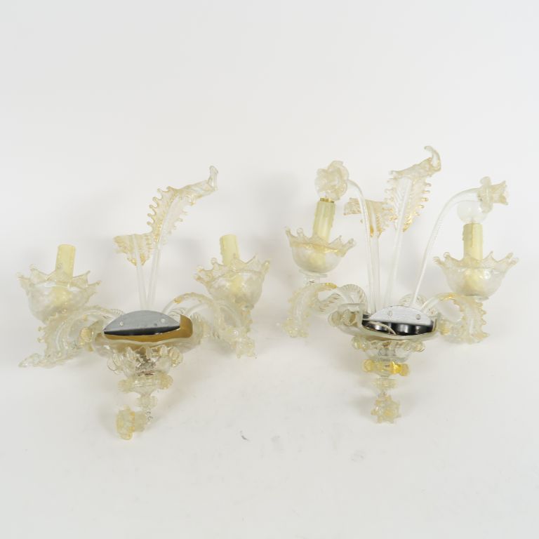 Paire d'appliques doubles en verre de Venise en verre translucide pailleté d'or. On y joint une applique double.