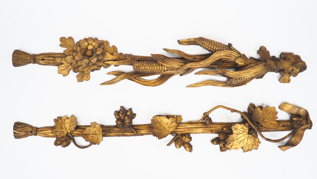 Paire de bois sculptés et dorés XIXème à décor de feuillage et de fruits. H. 65 cm (quelques sauts de dorure)
