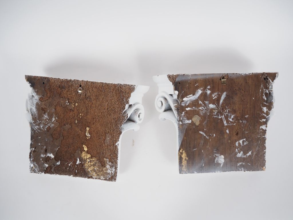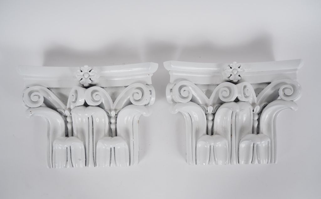 Paire de bois sculptés laqués blanc en forme de pilastres corinthiens. Dim. 25,5 x 35 cm