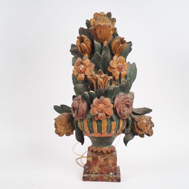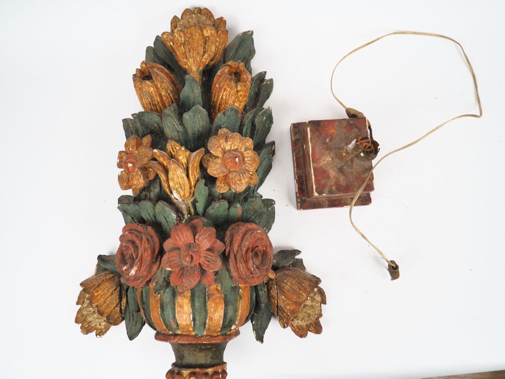 Paire de bois sculptés polychromes fin XVIIIème en forme de vase de fleurs, montés en lampe. H. 67 cm (petits manques et accidents)