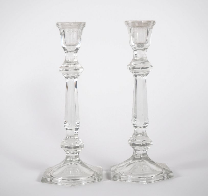 Paire de bougeoirs de forme balustre en verre moulé. H. 24,5 cm