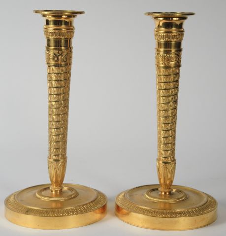 Paire de bougeoirs de style Empire en bronze doré et ciselé à décor de palmettes et de frises de feuilles d’eau. H. 25,5 cm
