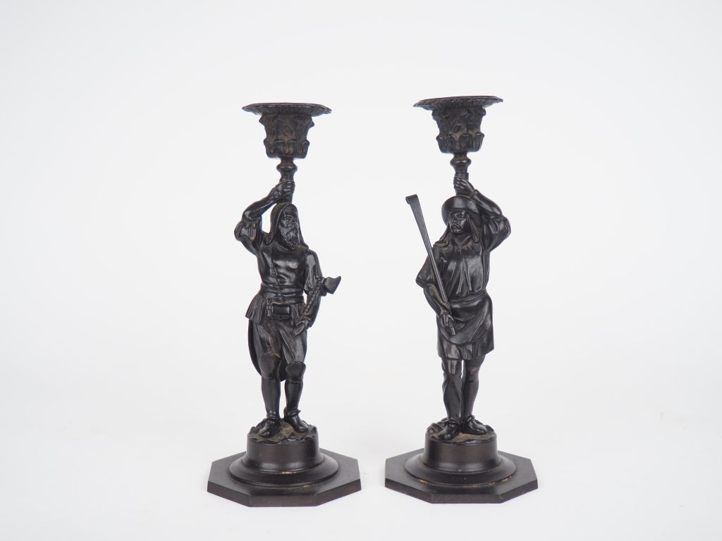 Paire de bougeoirs fin XIXème - début XXème en fonte à patine noire figurant deux bucherons. Portent un monogramme, 2 marteaux croisés. H. 25 cm.