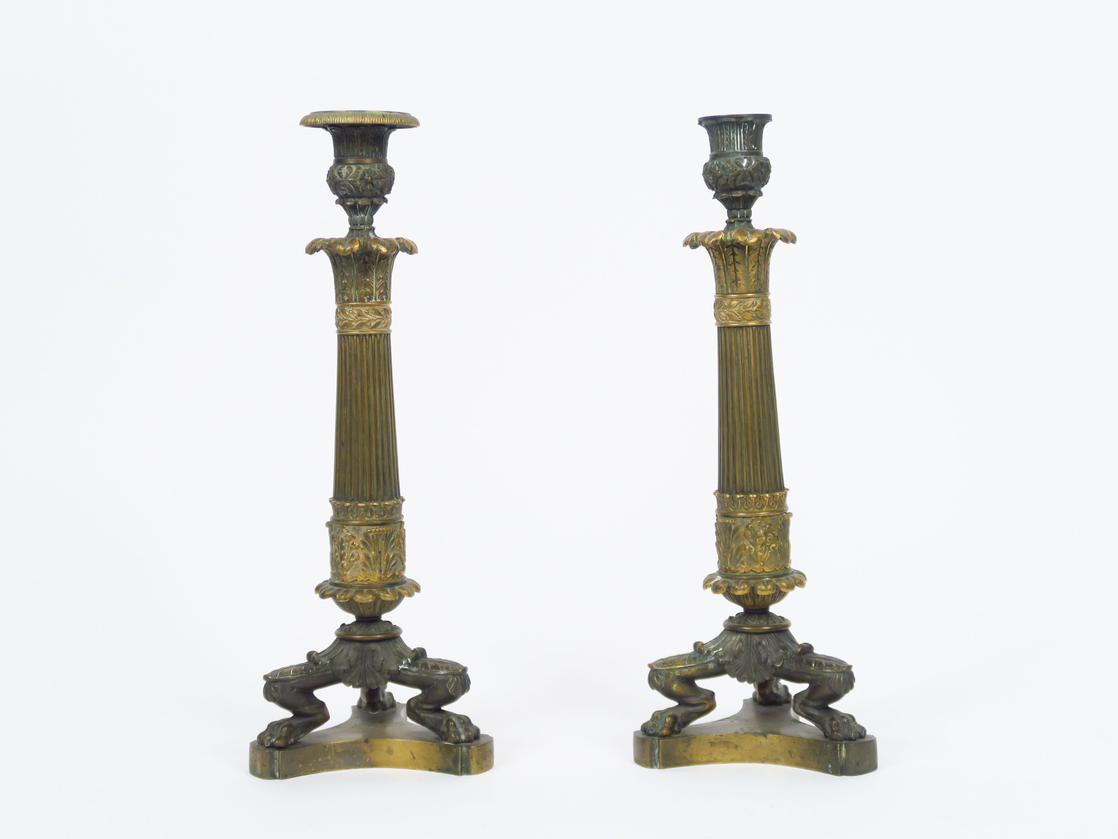 Paire de bougeoirs Restauration en bronze, reposant sur trois pieds griffe, à décor de feuillage et de godrons. H. 33,5 cm (manque une bobèche)