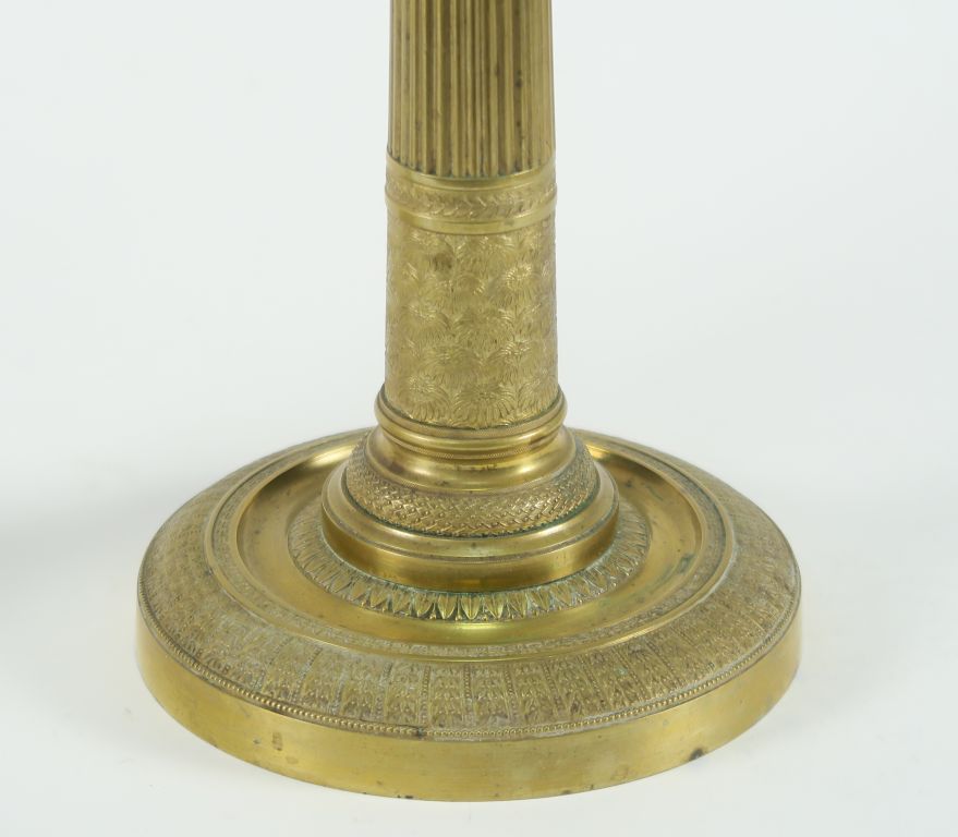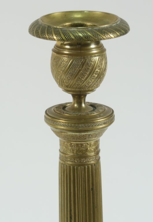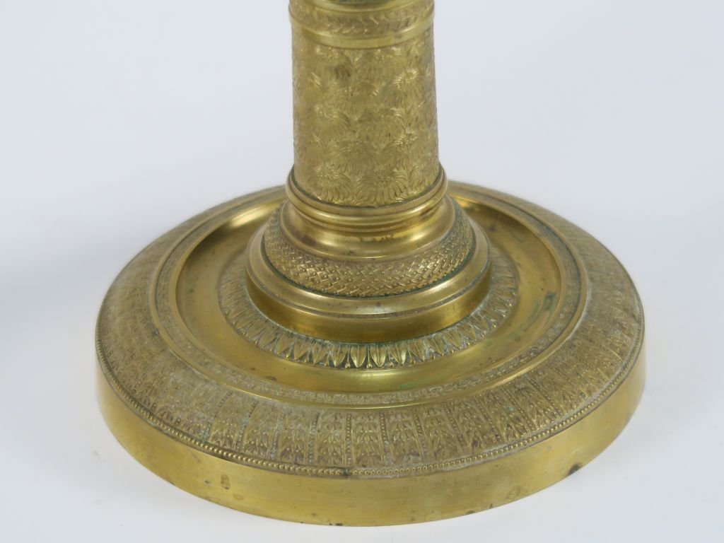 Paire de bougeoirs XIXème de style Empire en bronze, à décor de fleurs, de feuillages et de rais de cœur. H. 32,5 cm