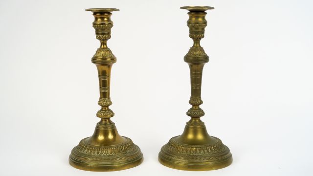 Paire de bougeoirs XIXème en bronze, à décor de feuilles d'eau. H. : 29,5 cm