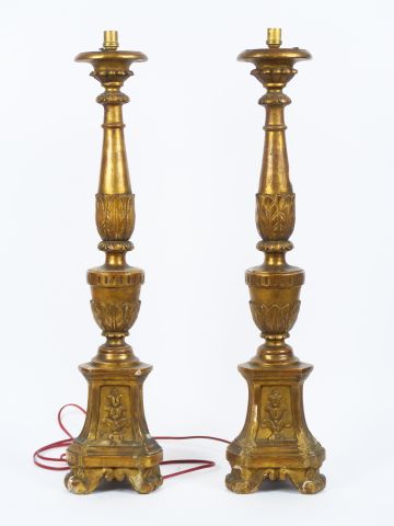 Lot de Paire de candélabres début XIXème en bois doré, montés à l'électricité au prix de 60 à 80 € en vente aux enchères par l'hôtel des ventes Primardeco